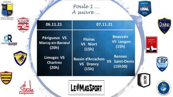 La surprise vient de Limoges, pas au mieux au début de saison, qui s’impose sur le terrain de Marcq-en-Barœul, l’un des prétendants à la Nationale. Dans le match des promus, Chartres n’a pas fait de détail face à Saint-Denis et empoche le BO. Dur, dur pour Périgueux, Floirac et Rennes mais ces trois équipes de tête signent de précieux succès à l’extérieur face à Langon, Drancy et Bassin d’Arcachon, ces 3 derniers arrachant tout de même le BD. Enfin, Niort continue son petit bonhomme de chemin sans avoir été franchement inquiété par Beauvais.