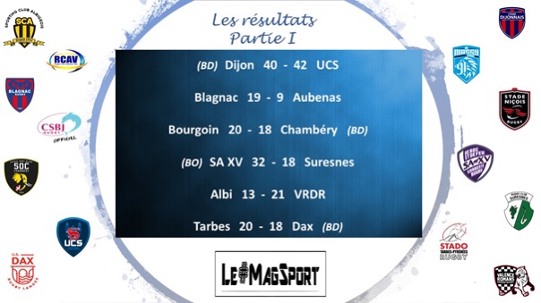 Le match de cette 8e journée de championnat se situait dans le bas de classement où au terme d’un match homérique, où les défenses respectives devaient être à la buvette, l’Union Cognac-Saint-Jean d’Angély remporte sa 2e victoire de la saison et la 1èreà l’extérieur sur le score incroyable de … 40 à 42 ! Pour Blagnac, c’est la confirmation d’une invincibilité à domicile avec une 4e victoire dans leur antre face à Aubenas. Très certainement surmotivé par le derby, Bourgoin fait chuter Chambéry à Rajon et s’offre sinon de l’air du moins un regain de confiance. Au Stadium, Albi a fait les frais du pragmatisme de VRDR qui, de plus en plus, semble être THE favori de ce championnat. Malgré des Suresnois qui n’ont jamais lâché et se sont battu jusqu’au bout, Soyaux-Angoulême empoche victoire et BO chez lui. Tarbes continue à jouer les trouble-fête de haut de tableau en s’imposant à domicile de deux petits points face à Dax.