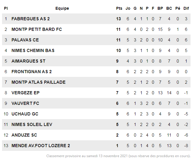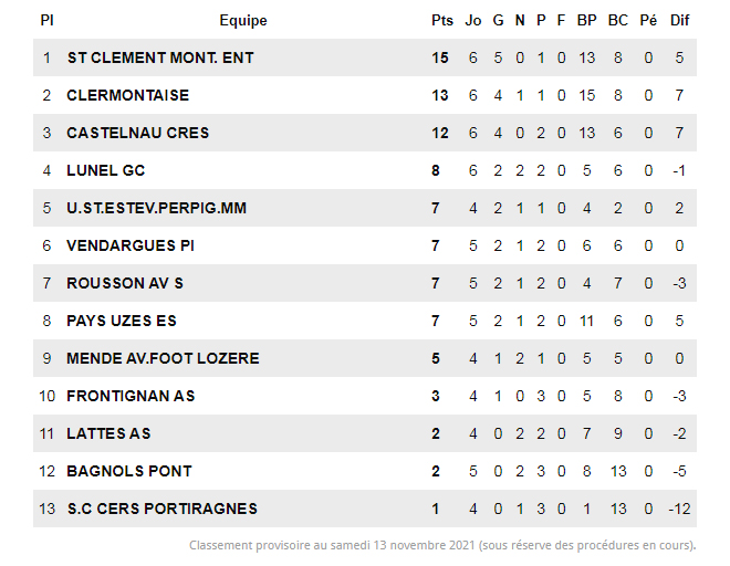En poule A, St Clément Montferrier n’a pas faibli dans le duel au sommet qui l’opposait à la Clermontaise. Les locaux l’emportent d’une courte tête ce qui leur permet de chiper à leur adversaire du week-end le fauteuil de leader. En revanche au fond du classement, ça ne bouge pas trop. Les équipes étaient exemptée, ou n’ont pas pris de points.