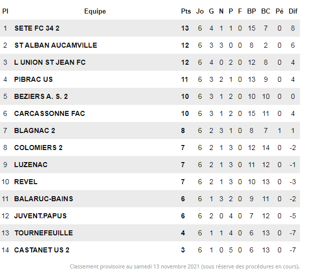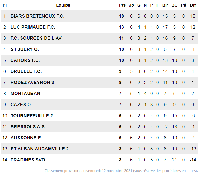 En poule C, Biars Bretenoux s’offre un succès net et sans bavure à St Alban et continue son périple avec maintenant cinq points d’avance sur son poursuivant, Luc Primaube et sept sur le troisième le FC Sources ! A noter également le premier succès riche en buts pour Pradines. Victorieux 5-3 de Bressols dans un match de mal-classés, ils se relancent en marquant leurs premiers points de la saison.