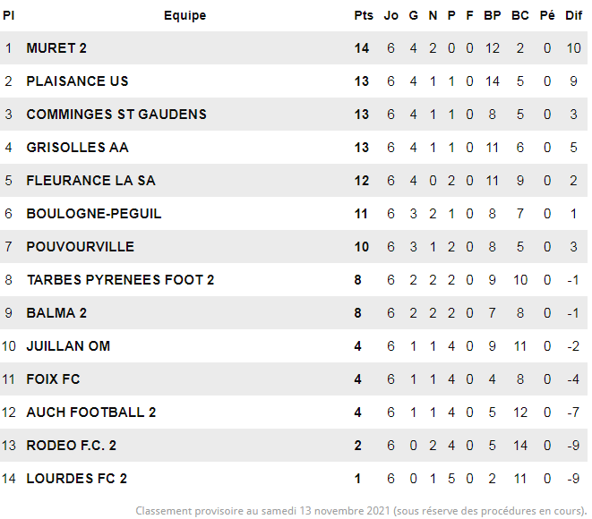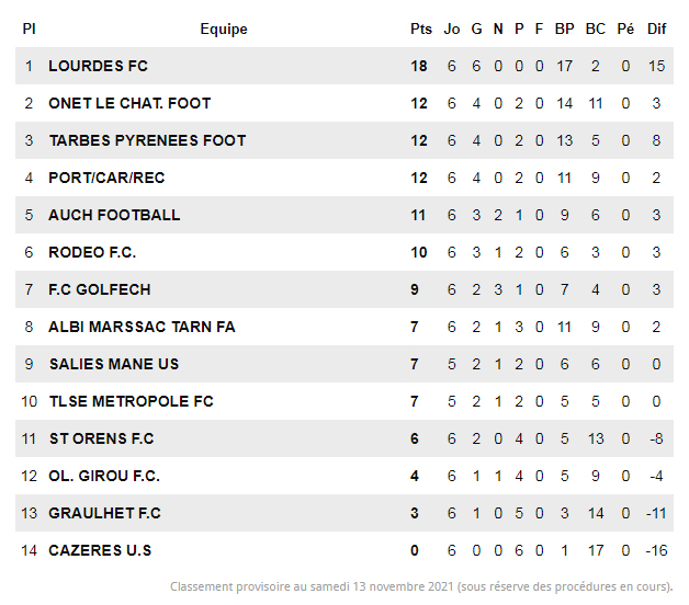 En poule C, Lourdes continue sa marche en avant et semble impossible à arrêter en ce début de saison avec six succès en autant de rencontres. Les Bigourdans rebalancent continuellement les cartes déjouant les pronostics et les ambitions affichées d’autres prétendants aux premiers rôles dans cette poule ! Un peu plus bas, l’AMTFA s’offre un réel bol d’air et confirme son joli succès contre Onet le week-end dernier. Un carton 5-0 à Cazères qui leur permet de sortir de la zone rouge et enfonce un peu plus Cazères qui n’attend pourtant que le déclic. Souhaitons leur qu’il n’arrive pas trop tard.