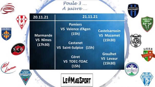 Hyères-Carqueiranne continue à rouler sur la poule 2. Un nouveau succès sur les terres du CS Beaune permet aux Varois de compter désormais 10 points d’avance sur son dauphin qui lui, change quasiment à chaque week-end. Cette fois-ci, c’est Vienne qui occupe la 2e place après avoir battu le Stade Métropolitain et si les premiers sont sur une très bonne dynamique, les seconds semblent marquer un léger arrêt. Les banlieusards lyonnais continuent néanmoins à faire jeu égal avec les sudistes Bédarrides-Châteauneuf du Pape, qui l’emportent d’un rien face à Mâcon, et La Seyne-sur-Mer, paisible vainqueur d’Issoire. La veille, Rumilly avait fait le bon coup en s’imposant d’un tout petit point chez Berre l’Etang ce qui permet aux Savoyards de rester au contact des places qualificatives. Place qu’il va être difficile d’atteindre pour Beaune et Berre qui se font distancer tandis qu’Issoire, malgré sa défaite recolle. Les deux derniers, Nuits-Saint-Georges et Châteaurenard n’ont pu se départager ce week-end, le match ayant dû être reporté pour cause de Covid chez Châto.