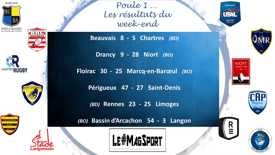 Première surprise, la chute de Rennes sur son terrain face à Limoges qui est l’équipe en forme du moment. Chartres a fait plus que résisté face à Beauvais tandis que la victoire de Floirac sur Marcq-en-Barœul sort ces derniers des 6 premières places. Niort et Arcachon n’ont pas fait de détails face à Langon et Drancy tandis que Saint-Denis, qui n’a rien lâché et a passé 27 points, subit la loi du leader Périgueux.