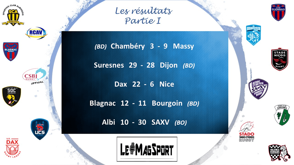 Déjà la 11e journée de Nationale et les choses se décantent de plus en plus. Massy est inarrêtable et signe sa 9e victoire consécutive sur les terres de Chambéry, infligeant ainsi sa première défaite à domicile au SOC. Un SOC rugby qui prend quand même un point de bonus défensif dans un match très fermé.