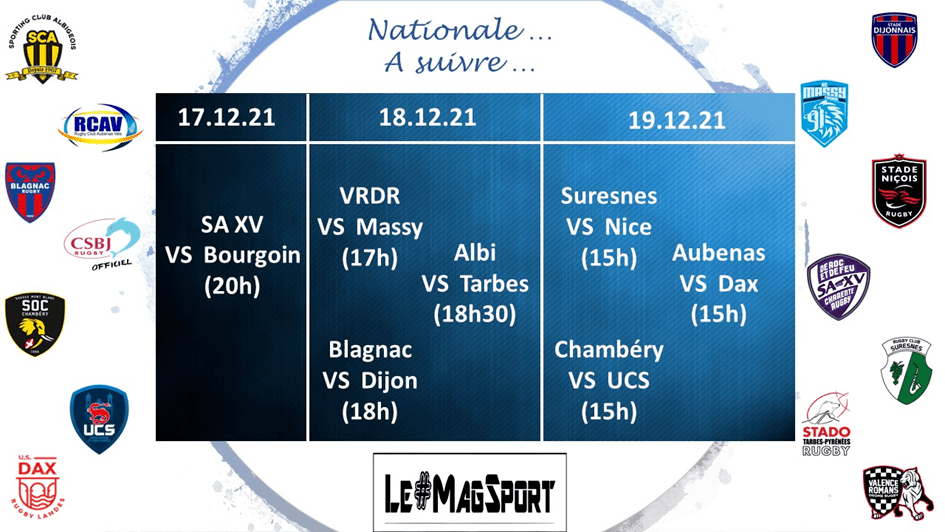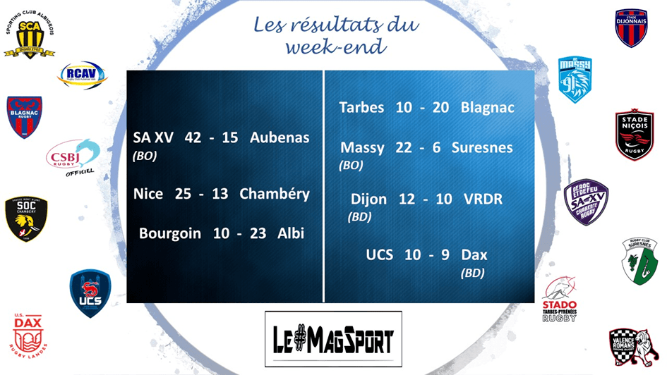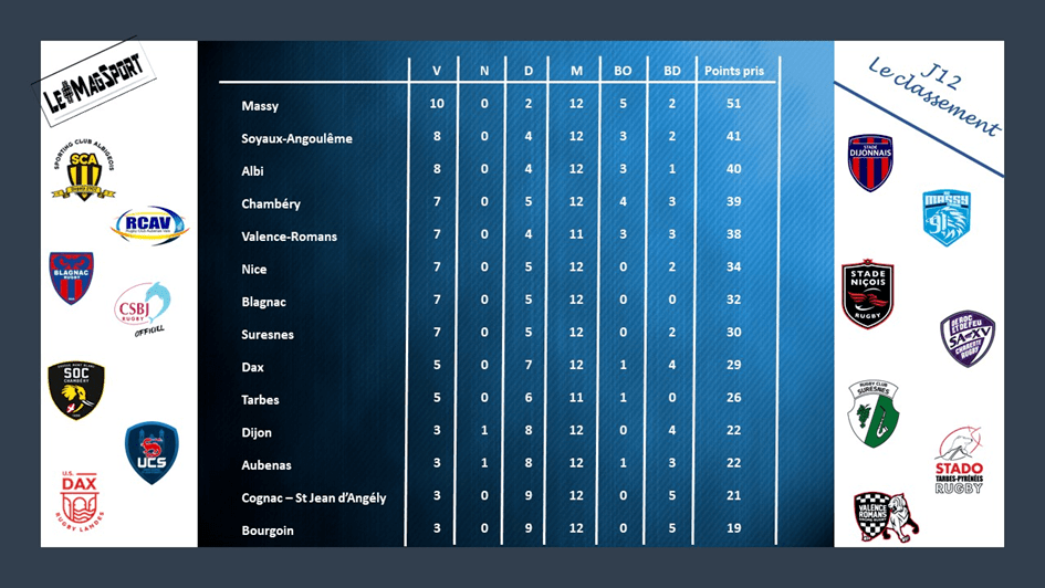 Suite et fin de cette 12e journée de Nationale avec un coup de tonnerre en Bourgogne où le Stade Dijonnais a fait chuter VRDR, certes de deux petits points, mais chuter quand même. Une superbe prestation qui permette aux Bourguignons de sortir de la zone de relégation et de faire le plein de confiance avant de se déplacer à Blagnac, stade réputé imprenable. Pour le VRDR, c’est la confirmation d’un mécanisme sinon cassé au moins au ralenti et les drômois se voit reculer au classement.