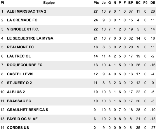 Quatre reports, seulement trois rencontres jouées, on peut dire que cette dixième journée de D1 aura été des plus édulcorées du fait des conditions climatiques. Ça aura pourtant été l’occasion pour la réserve d’Albi-Marssac de faire un récital contre Roquecourbe en l’emportant d’un score net et sans bavure 10-0. Ce succès, couplé avec le report de La Crémade-Cordes, permet aux Albigeois de prendre seuls la tête de la poule, en attendant bien sûr que leurs adversaires directs jouent leurs matchs en retard. En bas de classement, Lautrec réalise sa bonne opération en battant Graulhet Benfica. Ils sortent ainsi de la zone rouge XXL, tandis que Brassac s’offre un peu d’air, au détriment du Pays d’Oc, même si les deux équipes demeurent dans la zone de relégation.