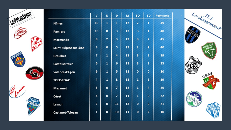 Le match qui était attendu entre Saint-Sulpice et Lavaur fut une nouvelle fois serré, les premiers s’imposant avec le BO, les seconds repartant avec le BD. Pamiers a eu un peu de mal à se défaire du TOEC-TOAC mais finit par empocher les 4 points tandis que Marmande assume de plus en plus son nouveau statut de potentiel leader en s’imposant largement face à Castelsarrasin.