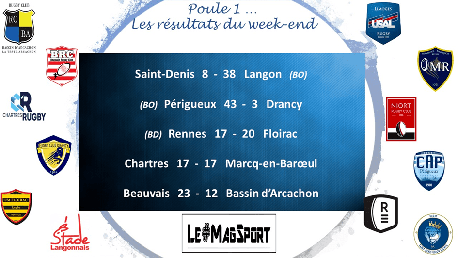 Dans le duel des mal classés, Langon n’a pas fait de détail face à Saint-Denis et repart de la banlieue parisienne avec le point de BO. Aucun souci non plus pour le leader Périgueux qui ajoute à nouveau 5 points dans son escarcelle après avoir disposé de Drancy. Enfin, dans la course aux play-off, Beauvais s’est imposé face au Bassin d’Arcachon.
