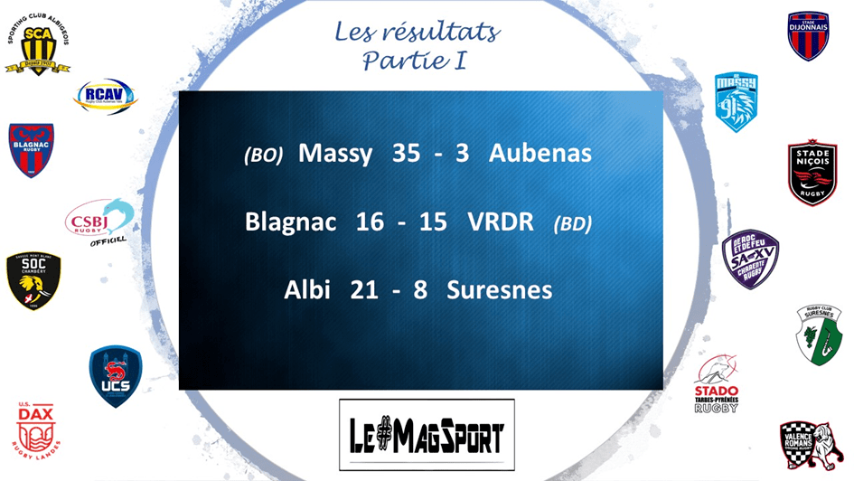 Du côté du Stadium, Albi n’a pas été flamboyant mais a assuré l’essentiel, à savoir les 4 points de la victoire face à des Suresnois pour qui il n’aurait pas été scandaleux d’être récompensés par un point de bonus défensif. Le SCA fait clairement la bonne opération de cette première partie de journée et aura sûrement un œil attentif demain sur la rencontre SA XV / Chambéry histoire de voir s’il n’y aurait pas moyen de mettre la main sur la seconde place.