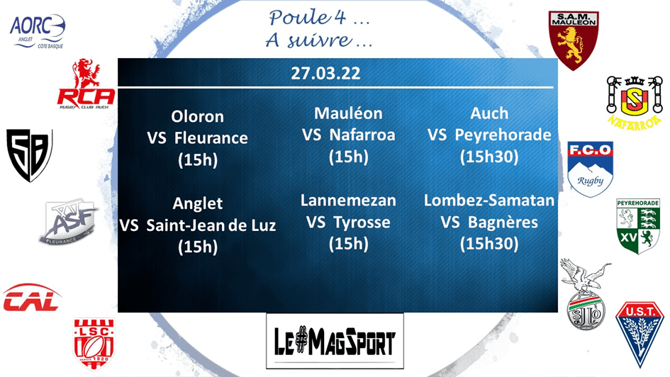 Saint-Jean de Luz inflige à Auch sa 2e défaite d’affilée, ce dont profite Fleurance, vainqueur d’Anglet, pour prendre la tête de la poule. Attention cependant, n’oublions pas qu’Auch compte encore un match de retard. Tyrosse dispose facilement de Mauléon tandis qu’Oloron réussit à s’imposer à Bagnères-de-Bigorre qui n’est pourtant pas réputé pour laisser ses adversaires gagner chez lui. Chez les mal-classés, Nafarroa n’a fait qu’une bouchée de Lombez-Samatan, BO à la clé. Enfin, Peyrehorade et Lannemezan n’ont pu se départager et repartent chacun avec deux points dans leurs escarcelles.