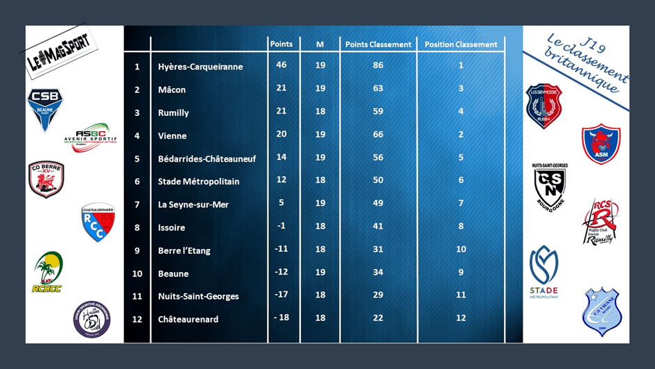 Il ne faisait pas bon recevoir ce week-end en poule 2. En effet, à l’exception de La Seyne-sur-Mer qui l’emporte par une pénalité d’écart face au Stade Métropolitain, toutes les équipes qui se déplaçaient se sont imposées chez leurs hôtes du jour. Mâcon continue à prouver qu’il faudra compter avec lui après sa victoire à Berre l’Etang, Rumilly casse la superbe dynamique de Vienne en allant aussi s’imposer de trois points et Hyères-Carqueiranne a pris un léger large sur Bédarrides-Châteauneuf du Pape. Issoire, vainqueur de Nuits-Saint-Georges, ne lâchera pas sa 8e place, dernier strapontin pour les play-offs tandis que les week-end se suivent et se ressemblent pour Beaune qui, si les matchs duraient 70 minutes, joueraient les premiers rôles. Encore un essai de pénalité concédé à la 79e et voilà qui fait la joie de Châteaurenard qui signe ainsi son 3e succès de la saison.