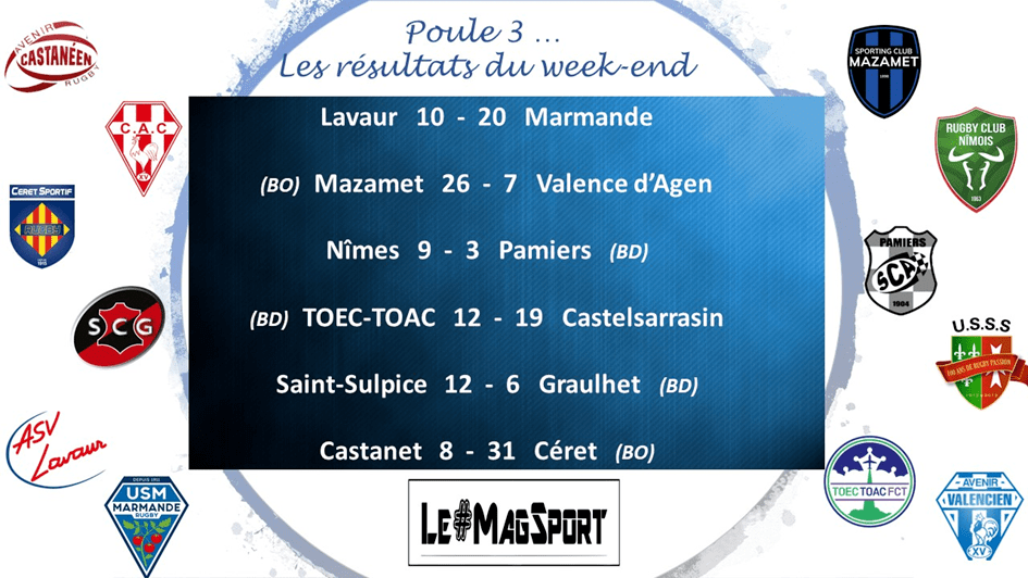Dans le choc des leaders, Nîmes a pris le dessus sur Pamiers mais avec difficulté. Après un déplacement victorieux à Lavaur, Marmande reste bien ancré sur la 3e marche du podium. En s’imposant face à Graulhet, Saint-Sulpice laisse ces derniers à quelques longueurs. Grâce à son succès bonifié contre Valence d’Agen, Mazamet recolle aux points juste derrière Castelsarrasin qui bat le TOEC-TOAC chez lui. Grâce aux 5 points récoltés à Castanet, Céret reste dernier qualifiable.