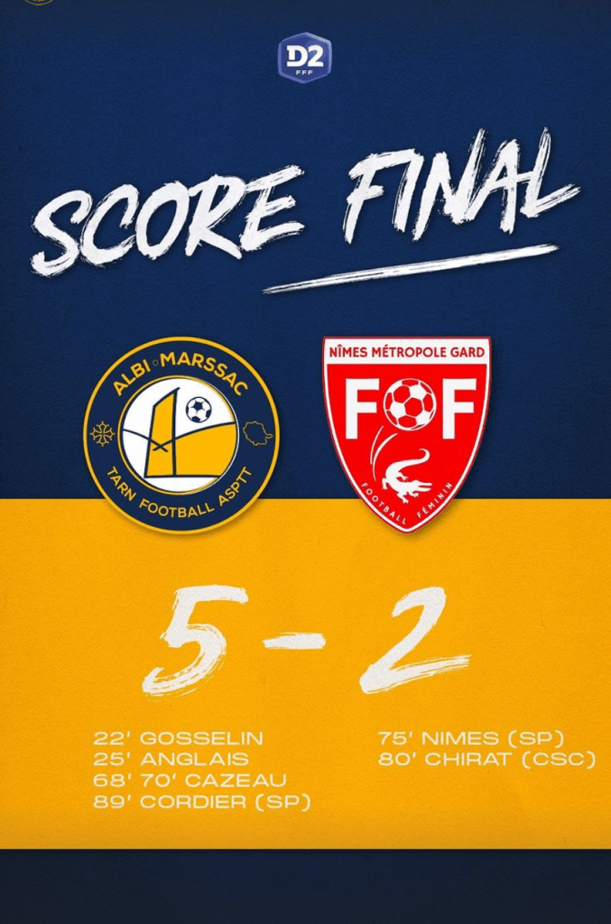 Les joueuses de Nicolas Castanier se devaient de réagir, c’est chose faite avec cette victoire convaincante face aux Gardoises. Albi-Marssac, qui devait composer en l’absence de Zemzem, avait décidé de renouveler son 3-6-1 en plaçant Cazeau à la pointe de l’attaque et Anglais et Revelli en piston alors que le FFNMG avait décidé de passer à 5, derrière, pour cette rencontre. L’AMTF domine rapidement son adversaire et ouvre la marque dès la 30ème minute. Après un déboulé, côté droit, de leur numéro 8, Cazeau adresse un centre au point de pénalty à Gosselin qui ne tremble pas. Quelques instants plus tard, Anglais, de retour de blessure, part à la limite du hors-jeu, élimine la portière nimoise et conclut dans le but vide (2-0). L’AMTF maitrise et rentre tranquillement aux vestiaires avec une avance de deux buts.