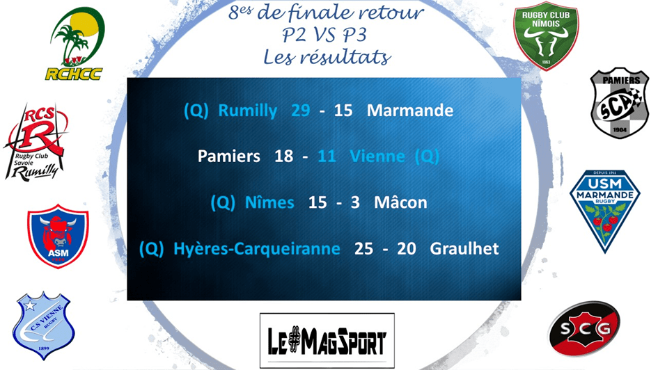 On savait les Nîmois solides, on ne pensait peut-être pas à ce point-là. C’est en patron que l’ex-patron de la poule 3 s’est imposé face à Mâcon, l’un des poids lourds de la poule 2. Bilan : deux matchs, deux victoires et un ticket validé pour les ¼. Oubliée la courte défaite du match aller à Marmande, Rumilly a fait le taf pour signer une victoire sans conteste aux Grangettes et voilà les rouge et noir savoyards qualifiés pour le tour suivant. Malgré sa défaite à Pamiers, le CS Vienne sera également de la partie. En conservant un écart favorable de deux points, les Isérois ont eu chaud mais seront bel et bien loin. Enfin, le grandissime favori Hyères-Carqueiranne La Crau a énormément souffert contre Graulhet, qui a mené tout le long de la rencontre. Le RHCC, qui avait fait le job à l’aller, l’emporte en toute fin de rencontre et franchit un nouveau pas vers son objectif de Nationale.