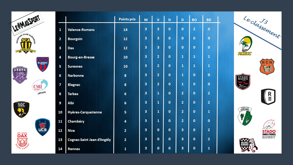 Dax est peut-être la surprise de ce début de championnat. 3 matchs, 3 victoires dont une plus que probante ce week-end face à Chambéry qui, lui, déçoit un peu. On s’attendait à mieux de la part des éléphants qui semblent avoir un peu de mal à se régler. Quant aux Dacquois, il va falloir s’en méfier chez eux tout comme à l’extérieur.