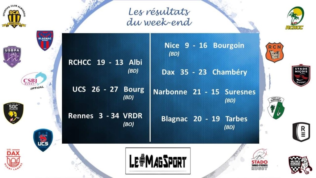 L’ex-pensionnaire de Pro D2 Bourg-en-Bresse s’est fait très, très peur cet après-midi. Victorieux d’un tout petit point sur les terres de Cognac, l’un des épouvantails de la poule a du mal à trouver sa vitesse de croisière mais engrange néanmoins les points. Quant à l’UCS, espérons qu’elle n’aura pas à regretter en fin de saison ces points perdus de peu afin de ne pas vivre une année aussi galère que l’an passé.