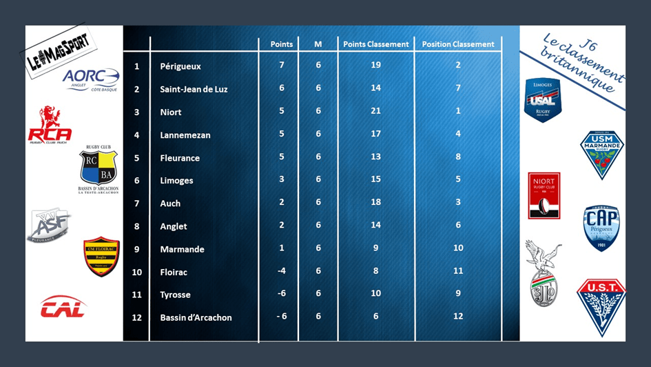 La perf du jour est signée Lannemezan qui est allé s’imposer sur les terres d’Anglet, une terre plutôt hostile avec les visiteurs. Le CAL ne fait pas de bruit mais s’affirme de week-end en week-end comme un prétendant aux qualifs. Déception pour les Basques qui, en plus de perdre pour la 1ère fois à domicile, ne prenne aucun point.