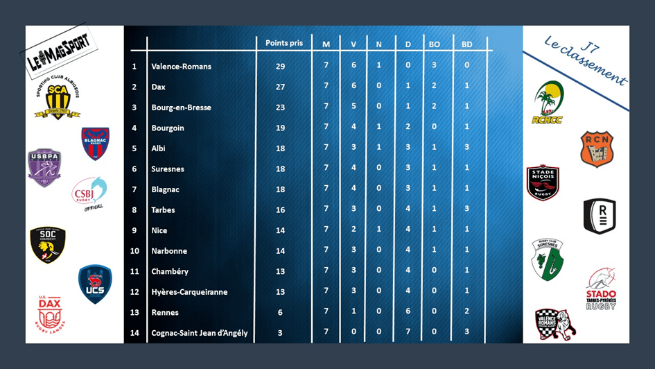 Hyères-Carqueiranne La Crau continue à faire de la résistance à domicile. En s’imposant face à Chambéry, le promu reste en position de premier non relégable mais à seulement 5 points de la 6eplace. C’est dire si cette Nationale est serrée ! Quant au SOC, il avance toujours cahin-caha, bien en deçà de ses résultats de la saison dernière et des ambitions affichées. Il n’empêche que prendre un point de BD lors d’une journée où tout le monde a engrangé des bonus est une très bonne chose pour ne pas se retrouver décroché.