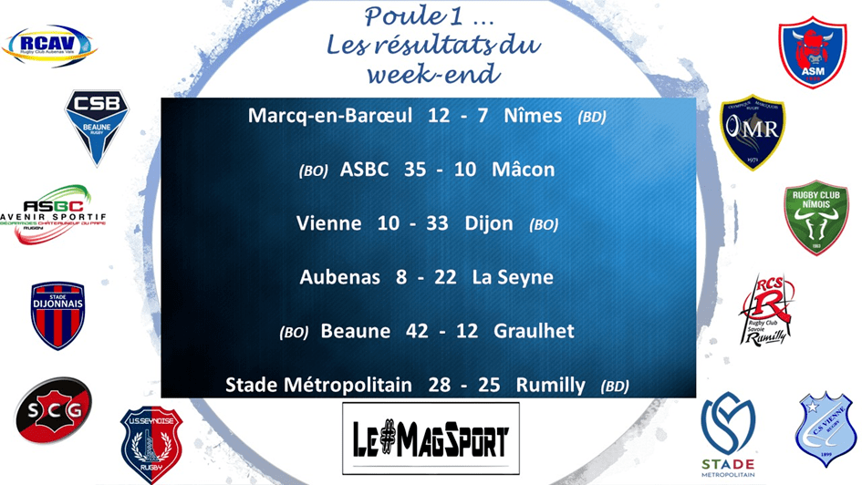 Marcq-en-Barœul serait-elle l’équipe en forme du moment ? Tout porte à le croire puisqu’ils ont infligé au leader incontesté et incontestable de la poule 1, Nîmes, sa première défaite. Les Nîmois n’auront cependant pas traversé la France pour rien puisqu’ils rapportent quand même un point de bonus défensif en guise de consolation. Quant à l’OMR, les voilà qui signent leur 3e succès d’affilée ce qui les place dans le peloton de tête.