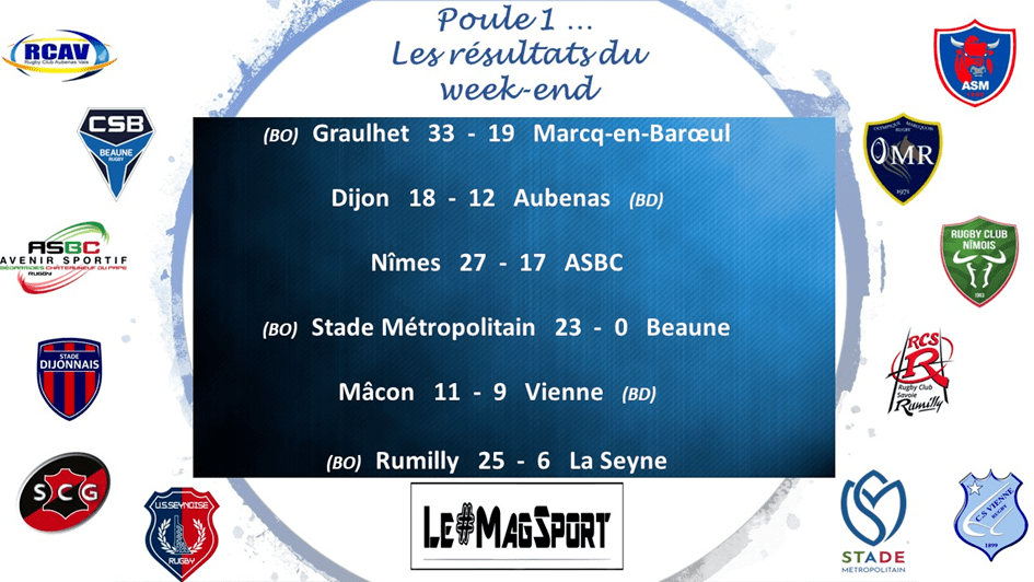 Les affrontements entre Dijon et Aubenas en Nationale avaient toujours donné lieu à des rencontres plus que serrées, se soldant souvent par des matchs nuls. Ça a encore été à couteaux tirés en cette 8e journée mais c’est bel et bien le Stade Dijonnais qui est sorti vainqueur de l’affrontement. Bonne opération pour les Bourguignons qui atteignent le Top 6 tandis que le point de bonus défensif des Ardéchois leur permet de quitter la dernière place.