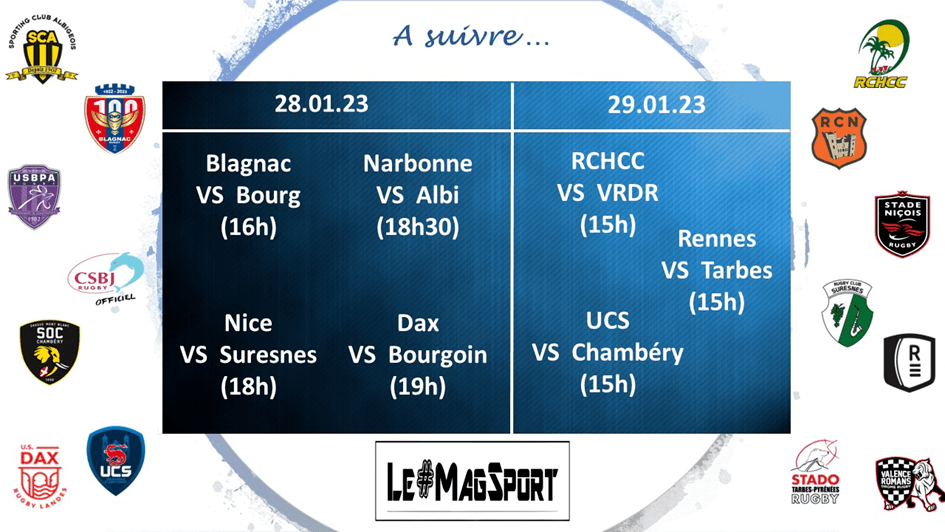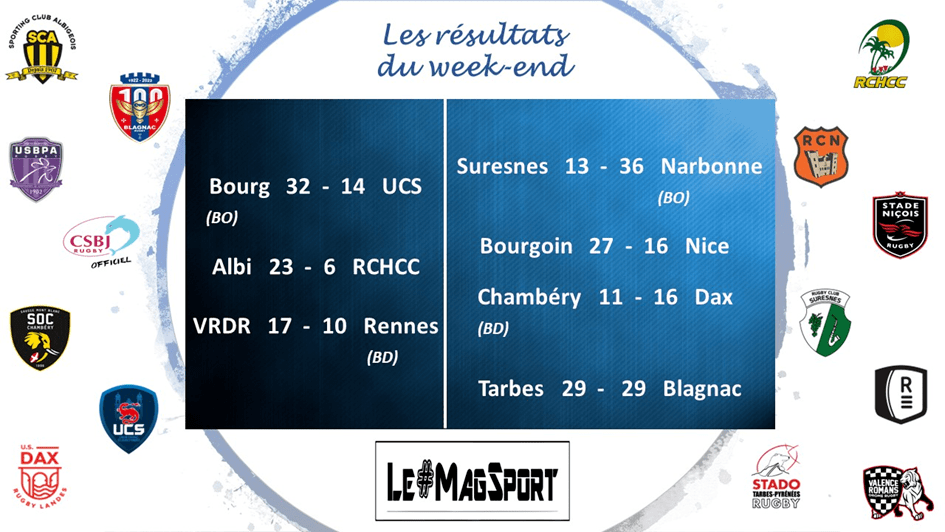 La palme du suspens du week-end revient à la rencontre à Trélut de Tarbes contre Blagnac. Si les Caouecs ont pris le match par le bon bout, profitant de l’indiscipline locale, c’est aux forceps que le Stado revient dans la partie et le pied de Fuertes leur permet de virer en tête à la mi-temps. S’en suivra un chassé-croisé essais / pénalités entre les deux équipes mais c’est bien Blagnac qui vire en tête à la 67e. Un essai de pénalité à la 80eet voilà les acteurs qui se séparent sur un score de parité et un match nul qui a sûrement fait pousser un ouf de soulagement aux Tarbais et un grrrr de frustration aux Blagnacais qui ont bien failli réaliser le coup parfait à l’extérieur.