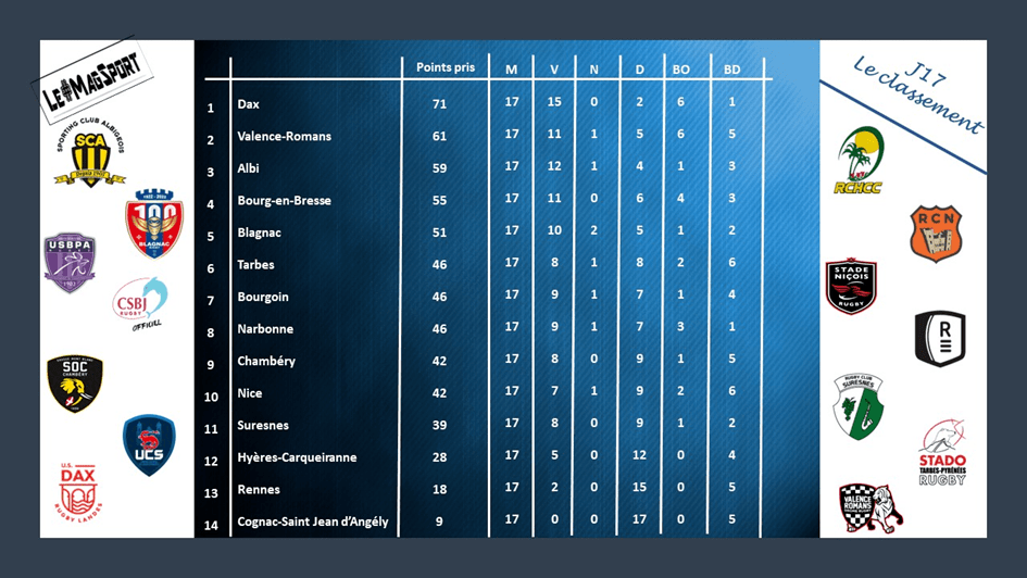 Si on pouvait encore en douter, Dax règne en maître sur la Nationale et rien ne semble pouvoir atteindre les rouge et blanc en ce moment. Bourgoin, qui s’attendait à un match dur, était venu avec des intentions dans les Landes mais n’a absolument rien pu faire face à des Dacquois en feu devant leur public. Si le score à la mi-temps restait serré avec un seul essai transformé d’écart, la seconde période fut dacquoise à 95%. L’USD se rajoute 3 essais dans son escarcelle contre une seule pénalité pour le CSBJ et voilà Dax signant un 15e succès en 17 rencontres, avec un 6e bonus offensif. Bourgoin, qui sort du Top 6, n’aura rien pu faire face à meilleur que lui.