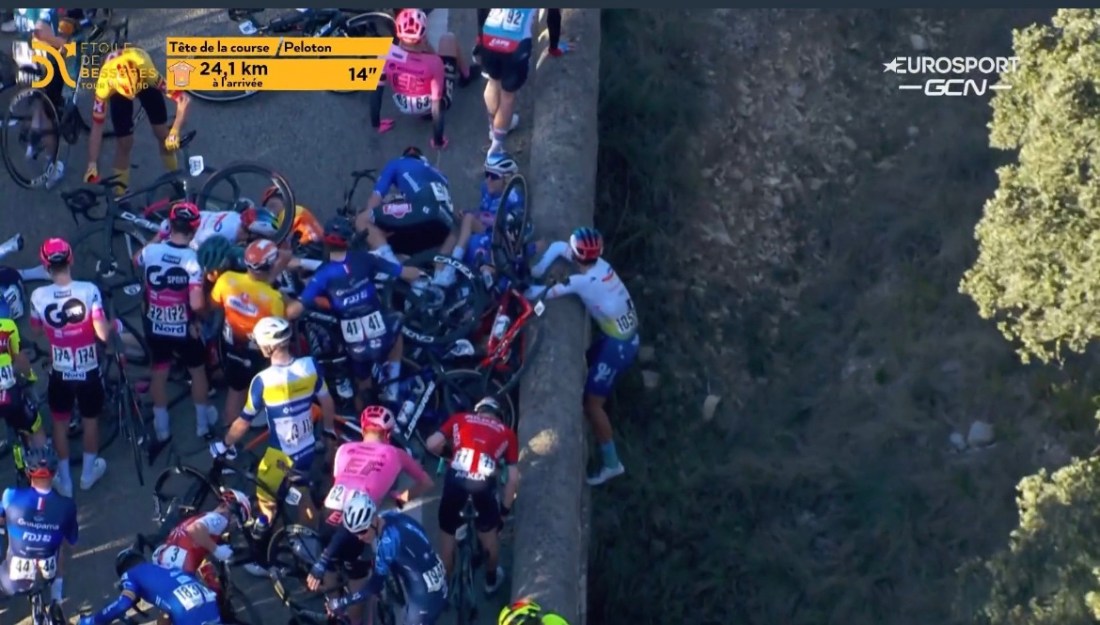 Une échappée matinale, la côte de Clarensac comme juge de paix, une première chute a 45 km de l arrivée, qui avait jeté a l arrière de la course le troisième du classement général Benoît Cosnefroy ( AG2R Citroën). Et soudainement a 22 km de l arrivée, a l’entrée d un pont, une énorme chute … Lire la suite #Cyclisme – Étoile de Bessèges / Etape2 :Neutralité dans le chaos.