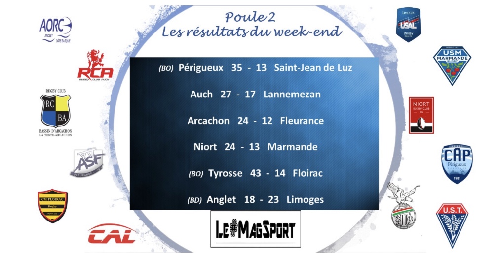 Autre affiche de la journée en poule 2, celle qui voyait s’opposer Périgueux, le premier, à Saint-Jean de Luz, le second. Le CAP, qui marche sur l’eau en ce moment, a montré que pas grand-chose ne lui faisait peur en ce moment en empochant les 5 points face à des Luziens qui payeront une 2e mi-temps ratée. Avec un score de 10-10 à la mi-temps, on imaginait un match plus serré que ce qu’il n’a été mais les Périgourdins ont déroulé tout leur talent sur les 40 dernières minutes pour franchir la ligne adverse à trois reprises et l’emporter avec un écart de 22 points. Une rencontre à oublier pour les Basques qui restent sur une dynamique en demi-teinte (1 nul, 1 victoire, 1 défaite) tandis que pour les Périgourdins, c’est la fête tous les week-end, eux qui s’affichent de plus en plus comme favoris à la montée en Nationale.