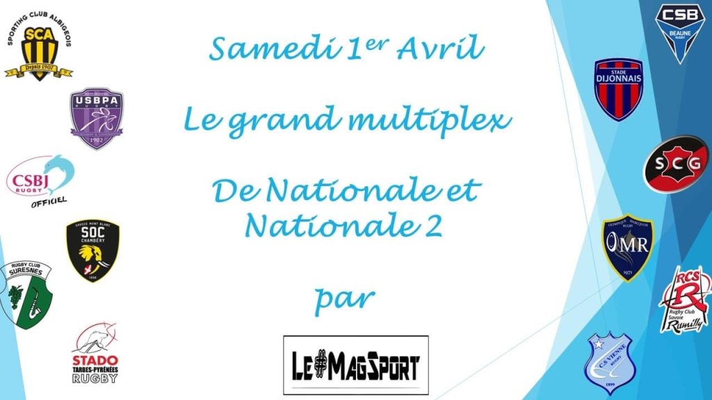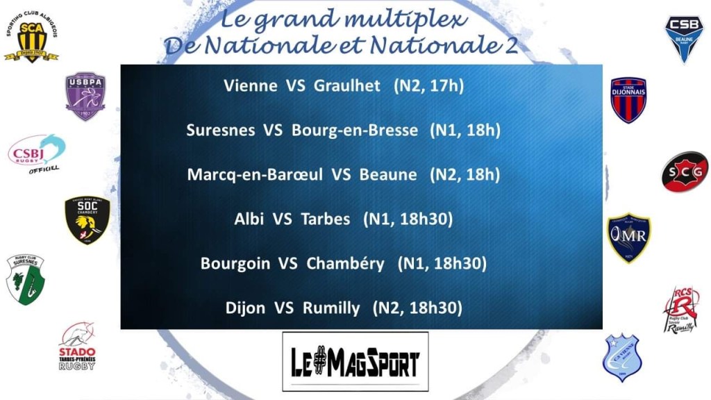 Retrouvez le grand multiplex de la 23 eme journée de Nationale opposant les jaunes et noirs du Sporting Club Albigeois, aux bigourdans du Stado Tarbes Pyrénées Rugby, ainsi que Bourgoin Vs Chambery et Suresnes tout comme la 21eme journée de Nationale 2 avec Dijon Vs Rumilly, Marcq en Baroeul Vs Beaune et Vienne vs Graulhet, en direct live dans « Le #MagSport / web radio » avec Loïc Colombié, Matthieu Santesmases ,Hugo Marsault, Kevin Laheurte, Gabin Cadot et Fred Charvet dès 17h ce samedi 1avril 2023.Vivez les rencontres du Monney Time en Nationale et Nationale 2 en live au coeur des Stades Etcheberry, Bourillot, Rajon, Jean Moulin et des Stadiums d’Albi et de Lille Métropole.