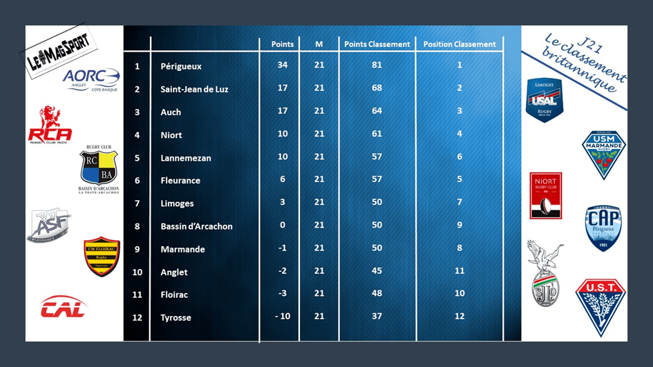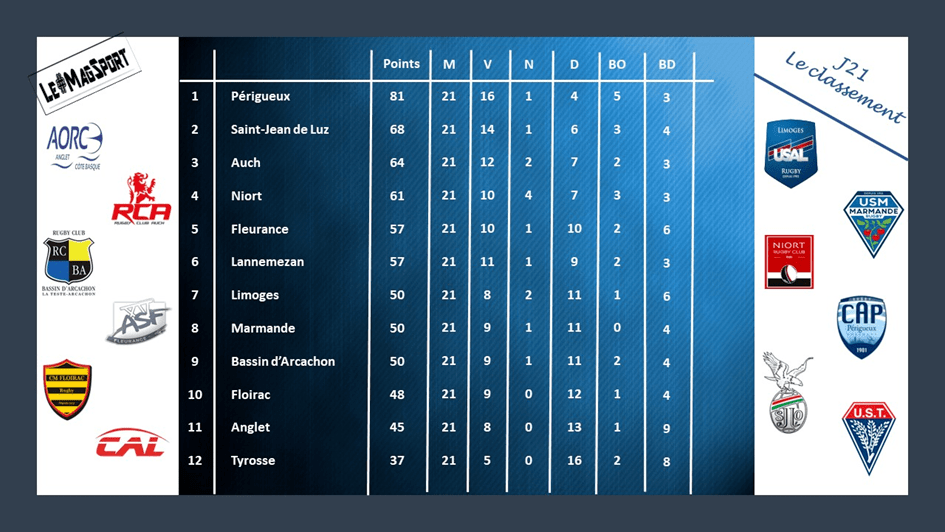 La 21e journée de Nationale 2 a presque rendu son verdict dans sa globalité. En poule 1, il faudra attendre les matchs en retard et la dernière journée pour savoir qui terminera 6e et dernier qualifié et qui accompagnera Beaune en Nationale 2. En poule 2, les 6 qualifiés sont d’ores et déjà connus, ne manque plus que le 2e relégué après Tyrosse.
