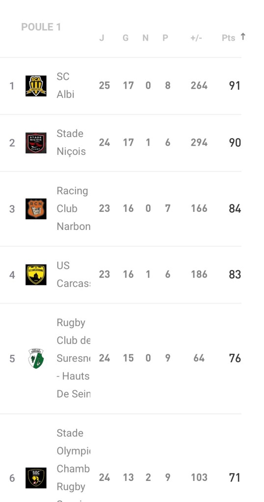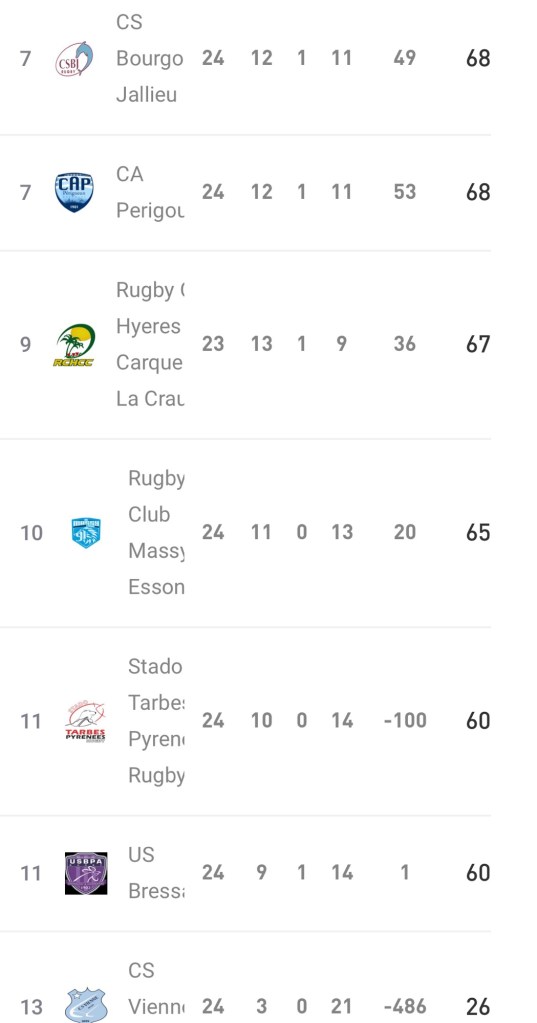 En effet le SO Chambéry (6eme / 71 points ) et le RC Hyeres Carqueiranne La Crau (7eme / 67points ) n’ont pas été récompensé par la FFR des points supplémentaires arbitrage. Un état de fait qui relance sérieusement Perigueux et Bourgoin dans la course à la qualification puisque les clubs du Périgord et d’ Isère reviennent à 3 points des savoyards et passent devant les Varois qui dégringolent à la 9eme place. Une situation qui fait les affaires de Suresnes qui sécurise encore plus sa 5 eme place.