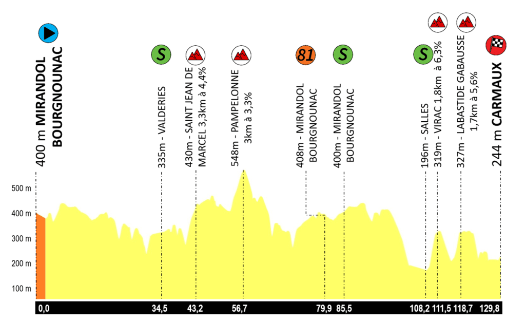 L’arrivée sera jugée à Carmaux, « la capitale » du territoire. Entre temps les coureurs auront à se disputer les divers maillots en jeu. Pour le maillot vert, trois points sont au programme chauds à Valderies (km 35), Mirandol-Bourgnounac (km 85) et Salles (km 108). Pour le meilleur grimpeur au terme des 1600m de dénivelé, les coureurs franchiront les difficultés proposées à St-Jean-de-Marcel (km 43) , Pampelonne (km 56) , Virac (km 111) et et le dernier Labastide-Gabausse, à seulement 11 km de l’arrivée.