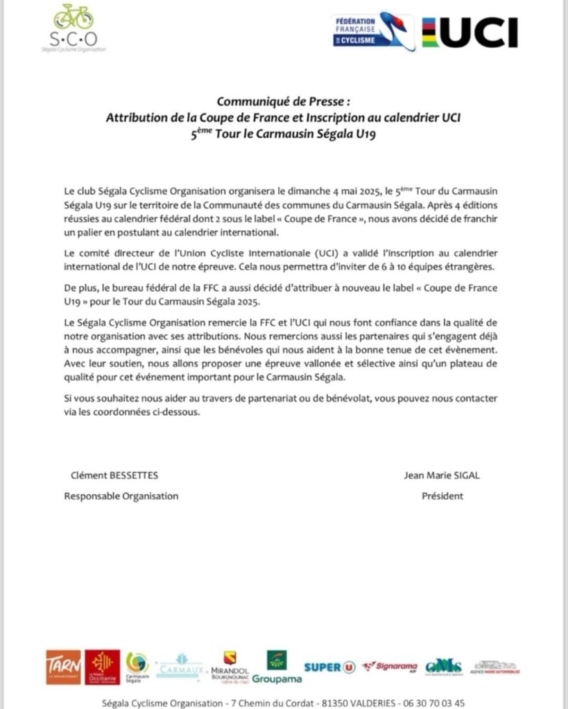La progression est consacrée via un communiqué du comité directeur de l’UCI. Outre une nouvelle inscription au calendrier coupe de France en 2025, les organisateurs reçoivent le label UCI. Un label obtenu par le fait que l’épreuve fédérale imaginée par Jean-Marie Sigal, Clément Bessettes, Mélanie Combes, Nicolas Sigal, et Philippe Bessettes a été retenue par deux fois dans la cadre de la coupe de France U19, et ne connaît que des succès.