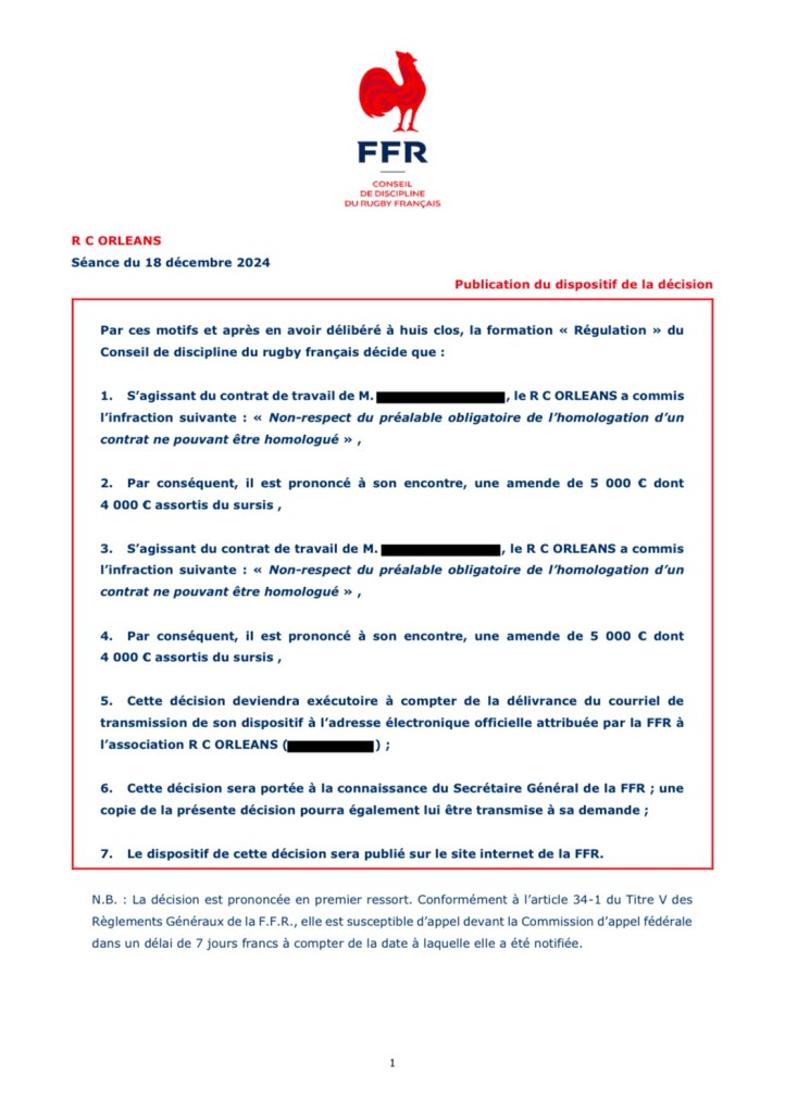En effet, le club phare du Loiret s’est vu signifier par le conseil de discipline du Rugby Français (ex conseil supérieur de la DNACG) une amende de 10 000 euros dont 8000 avec sursis le 18 décembre dernier.