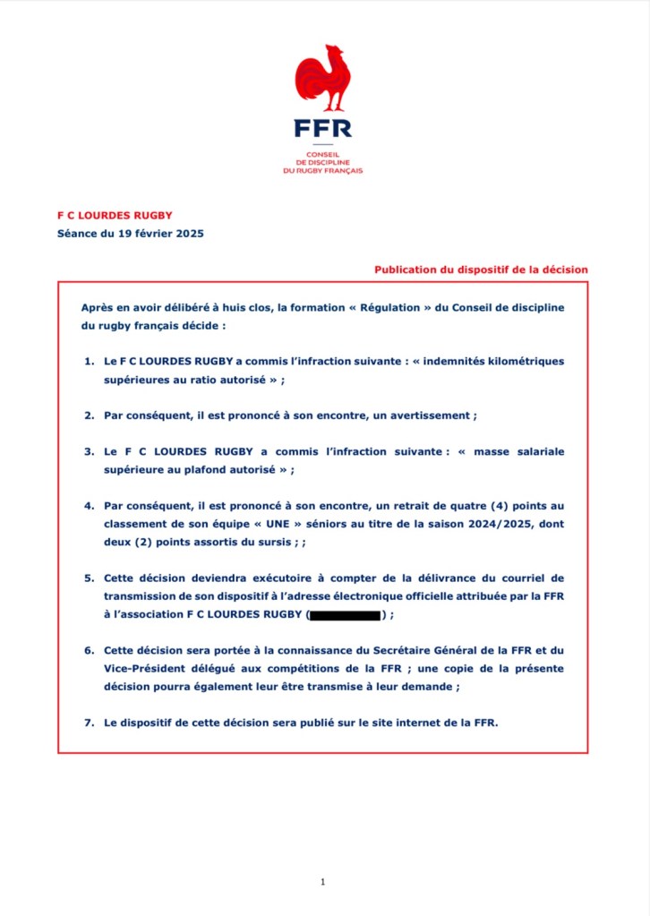 Du côté des Lourdais, l’ex DNACG a décidé tout d’abord d’infliger un avertissement aux Hauts Pyrénéenns pour : « indemnités kilométriques