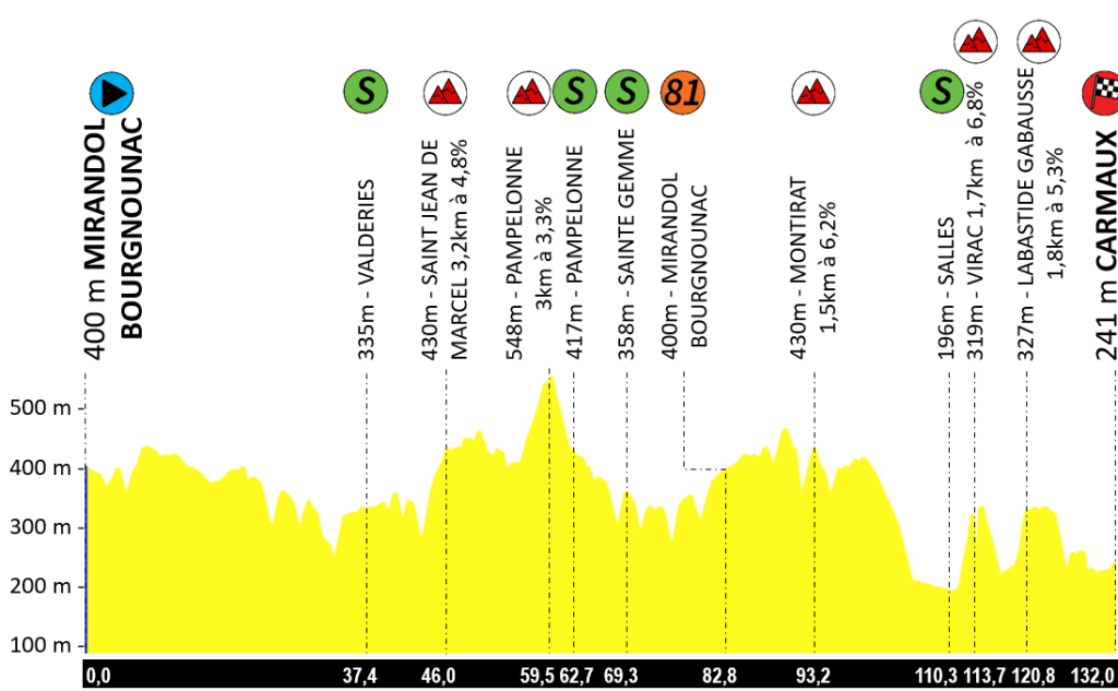 Outre les 132 km de course depuis de le départ matinal (10h45) de Mirandol-Bourgnounac jusqu’à l’arrivée à Carmaux prévue sur les coups de 13h45, les coureurs auront à affronter un dénivelé de 1700 m. Ils se disputeront 4 points chauds à Valdéries, Pampelonne, Salles-sur-Cérou et pour un deuxième passage à Mirandol-Bourgnounac pour le symbolique KM81.