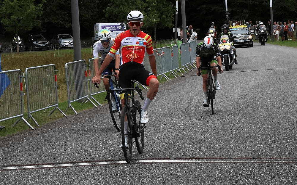 C’est au sprint qu’il devance ses compagnons de fugue, Evan Pavis (Vendée U) et Jamie Meehan (AVC Aix Provence Dole), déjà 3éme la veille.