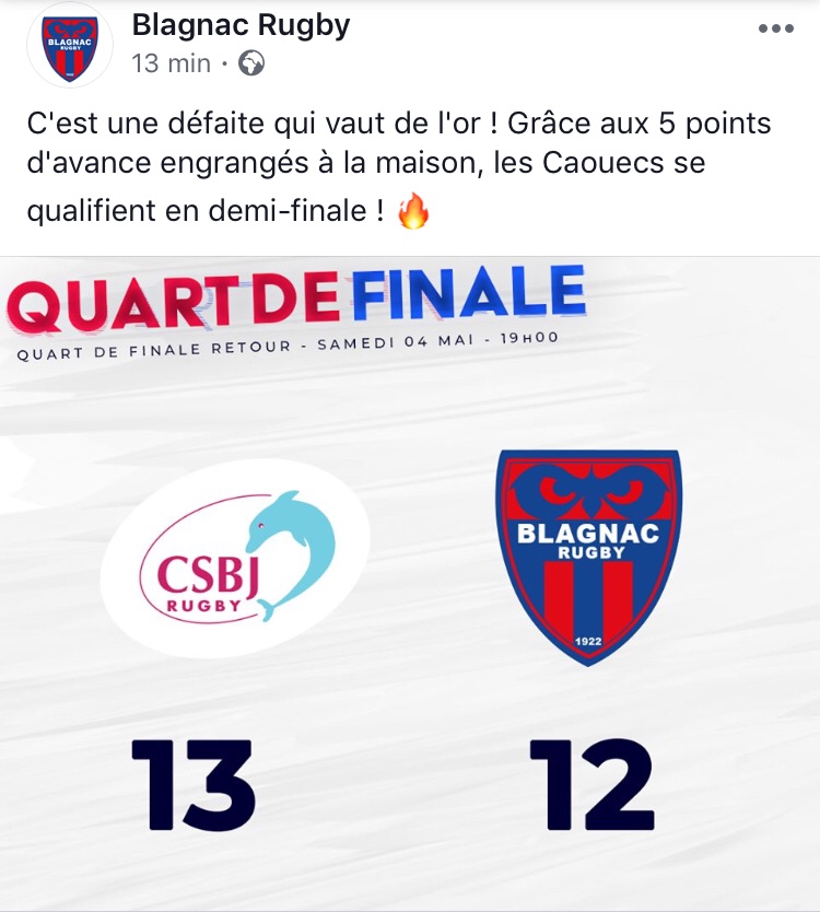Le Blagnac Rugby vient de s'incliner 13-12 à Pierre Rajon, face à un CSBJ incapable de renverser la tendance du match aller (21-16 pour Blagnac) . Grâce au score cumulé sur les deux matchs, les hommes Chritophe Deylaud affronteront en demi finale du championnat de Fédérale 1 : le vainqueur de VRDR vs SJLO au … Lire la suite #Rugby – Fed1 / Blagnac 1er qualifié pour les 1/2 du Jean Prat.